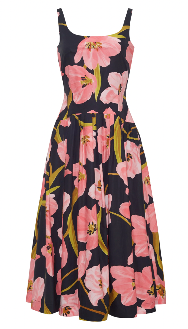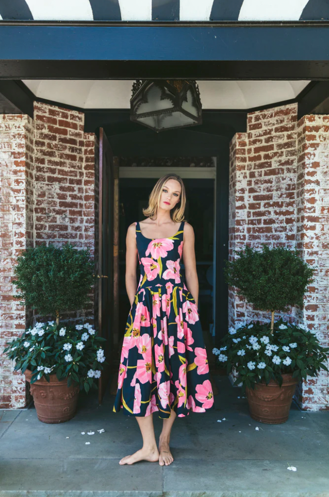 Ready for a summer wedding? This fitted midi dress had a curved dropped waist with a flared pleated skirt. Elasticated back bodice has smocking panel for ease. Center back zipper and functional side seam pockets.
