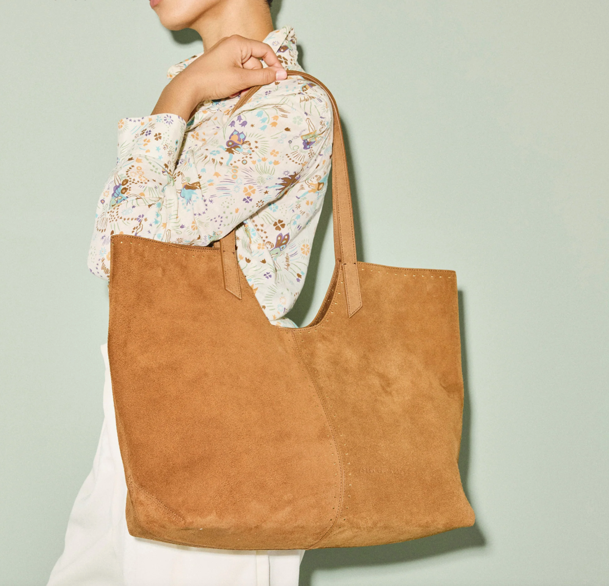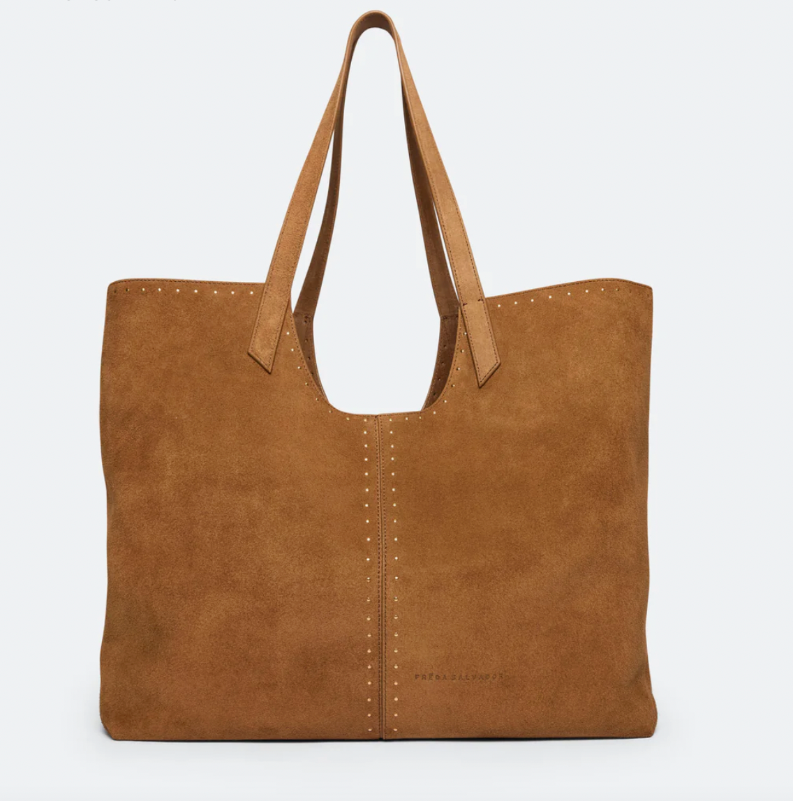 A must-have everyday tote—fits all your daily essentials. Made from 100% Italian suede that drapes beautifully, accented with mini studs. Unlined. Hidden magnetic closure and internal pouch has a zipper closure and is attached to the interior of the bag but a peg system that can be removed.