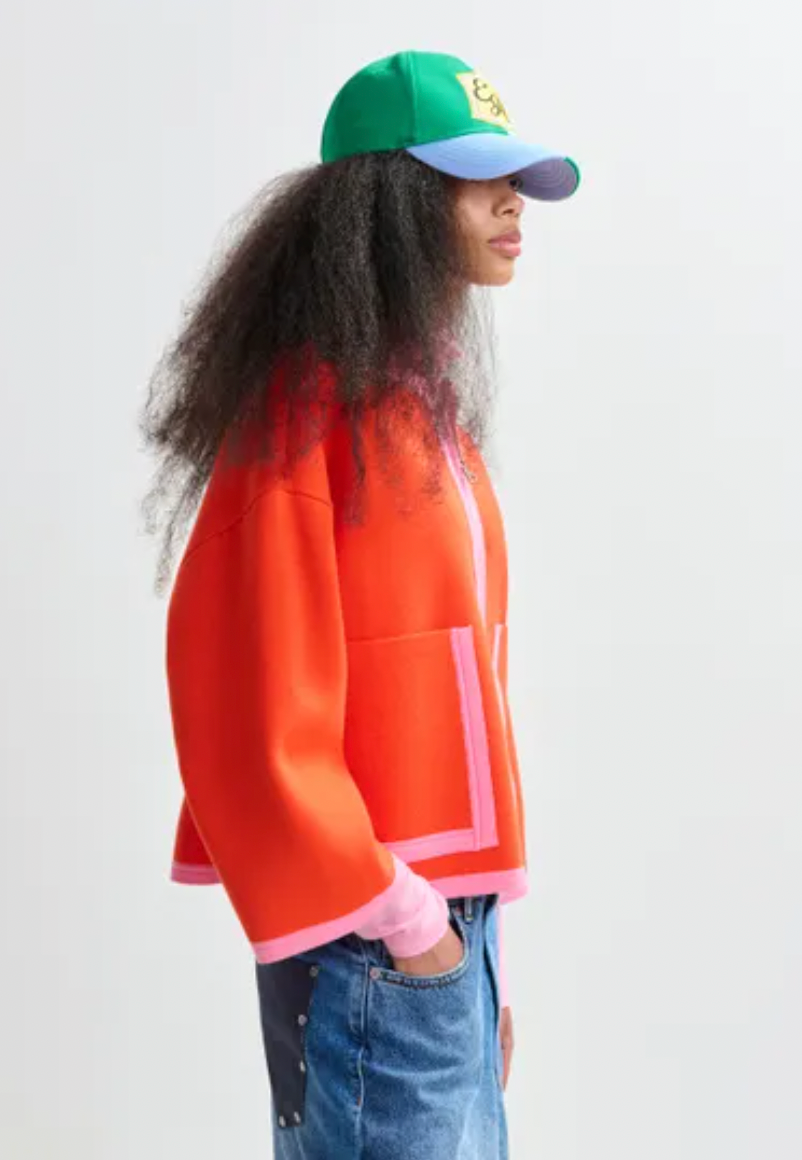 This boxy cardigan is designed with dropped shoulders and a relaxed silhouette. It features a front zip fastening, patch pockets, and contrasting trims. Double stitching outlines the garment, adding definition to the design.  Fit is oversized and relaxed.