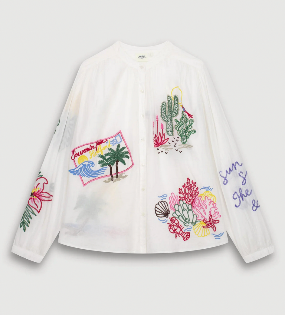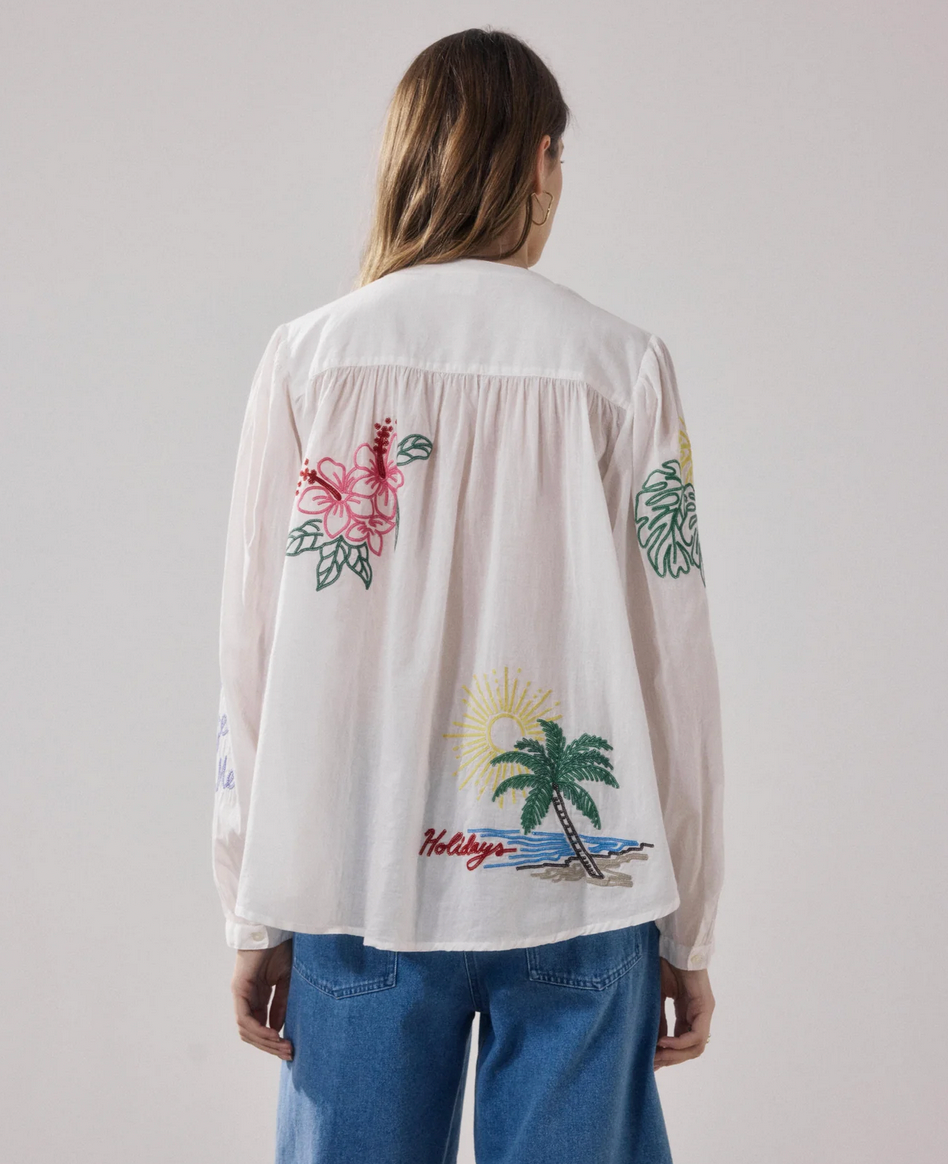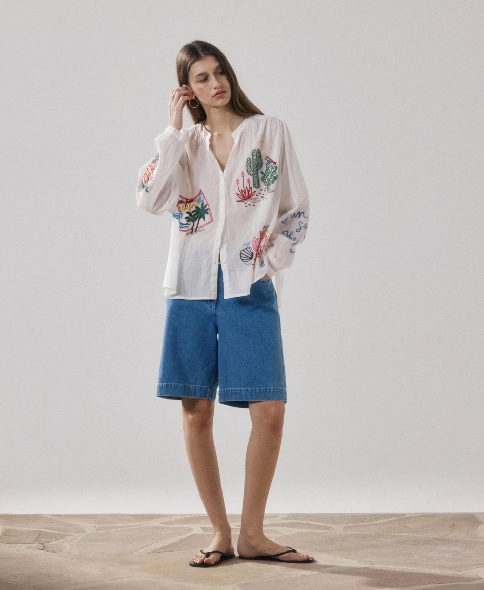 Hello Spring! This easy shirt has a round neckline with gathering details at the collar and sleeves. Colorful embroidery. Visible button placket finished with mother-of-pearl buttons.
