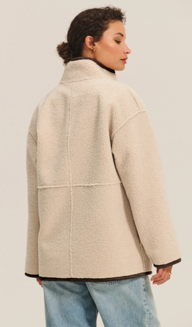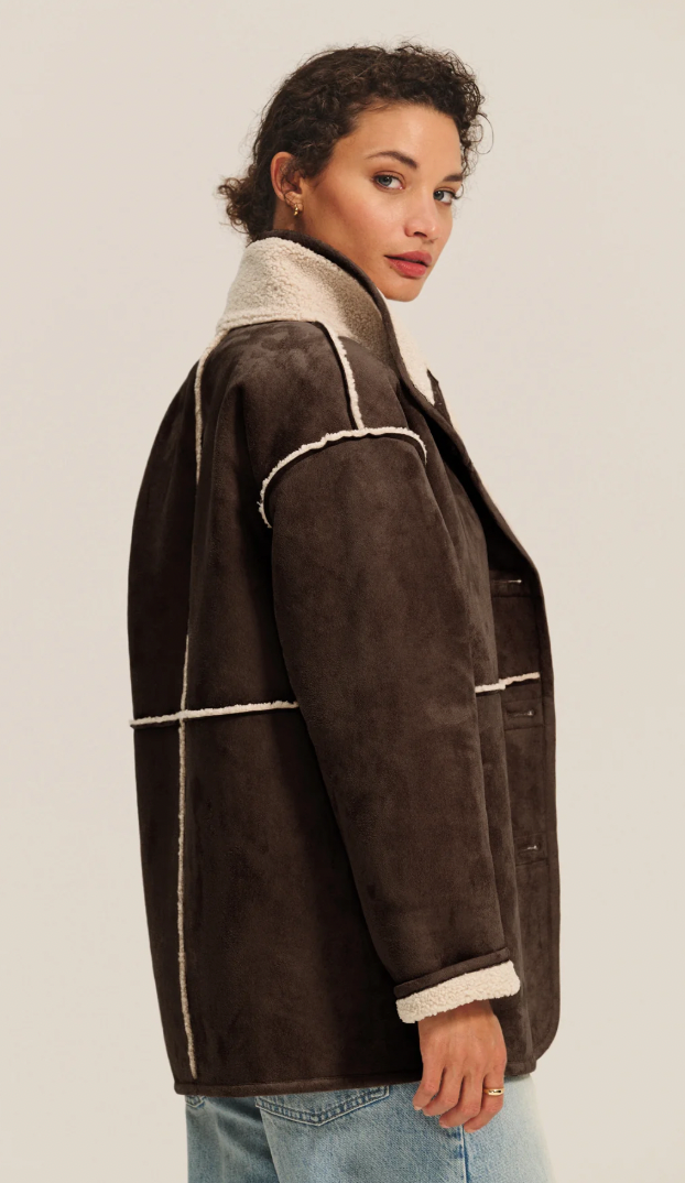 This reversible jacket offers two distinct looks—one side plush with faux sherpa, the other smooth in faux suede. Featuring button closures, dual side seam pockets on both sides, and an optional fold-over collar, it’s versatile layer designed to keep you cozy in style.