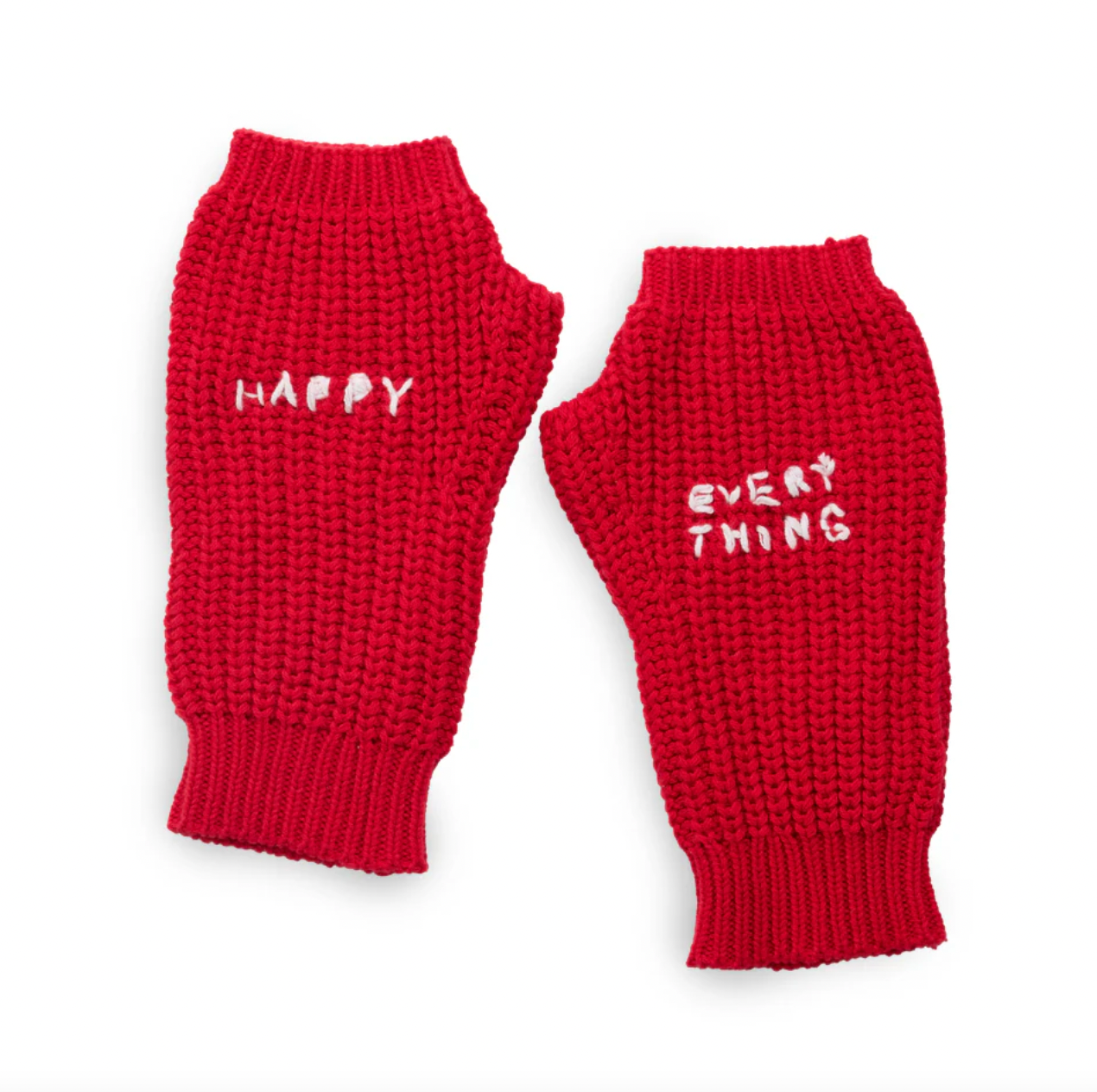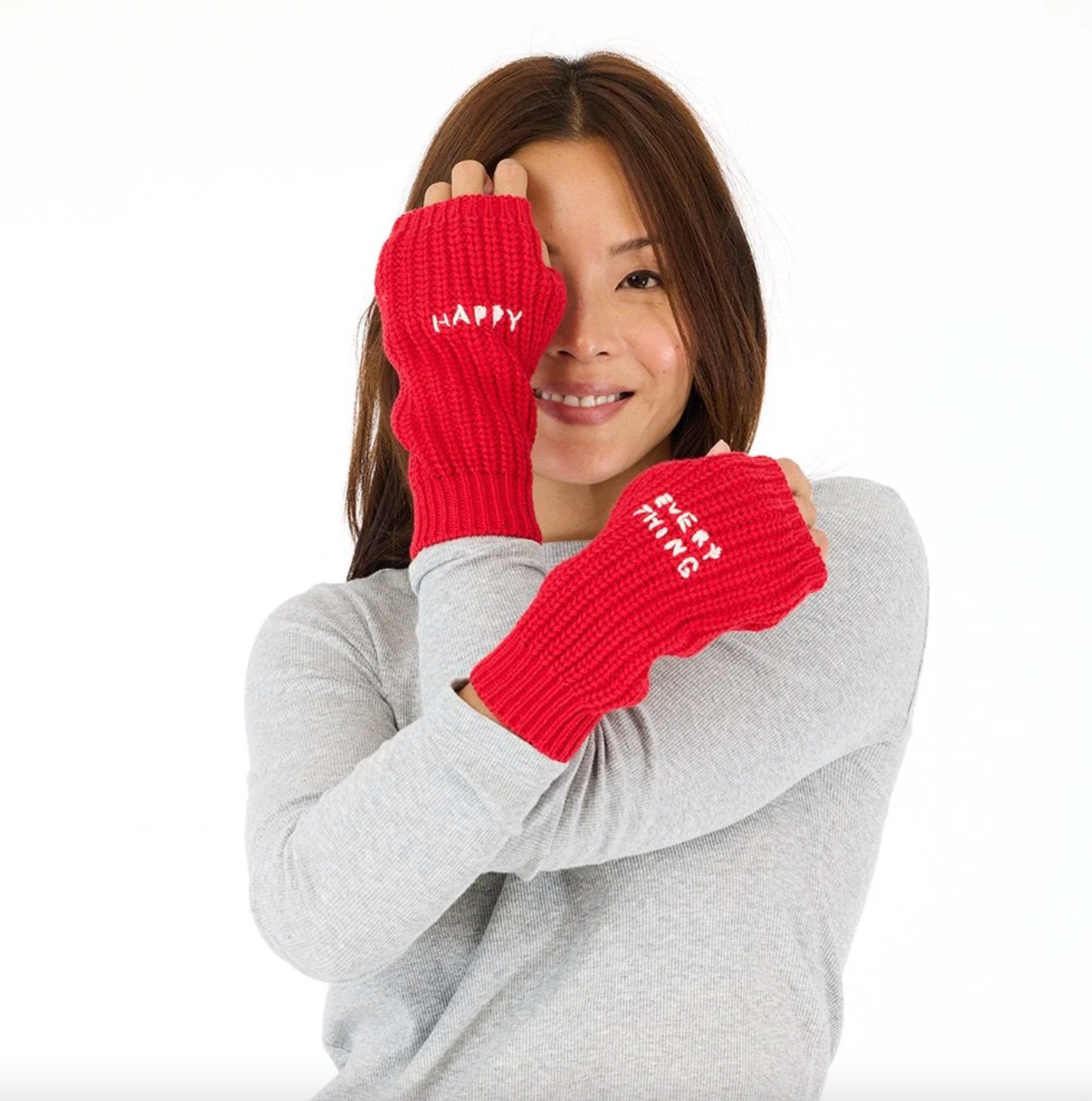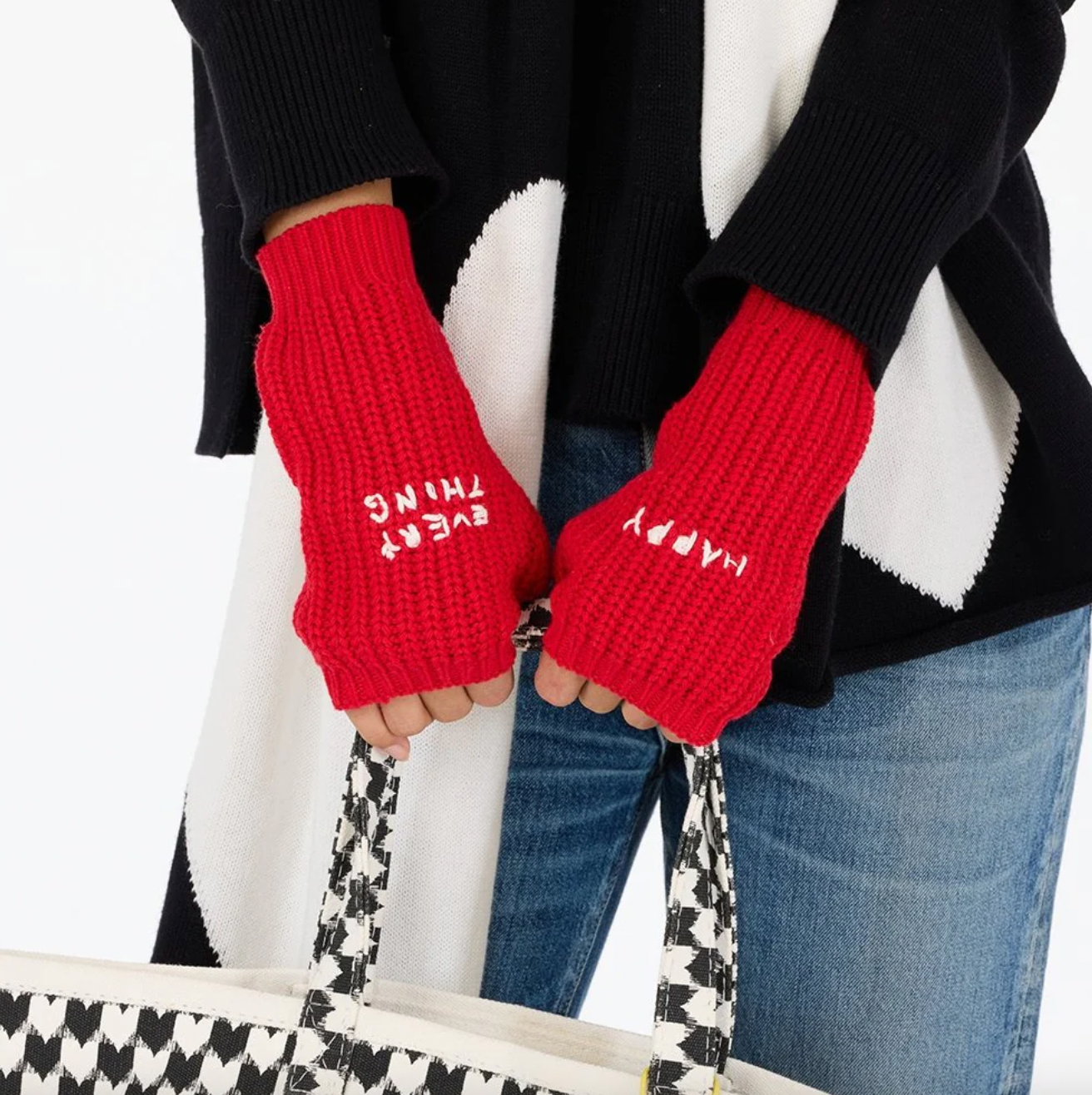 Happy Everything Smittens are fingerless gloves knit in a soft cotton-cashmere for a snug fit. The fingerless shape means you can show off your mani and respond to messages while wearing them.  8.5" Long.  Embroidered.