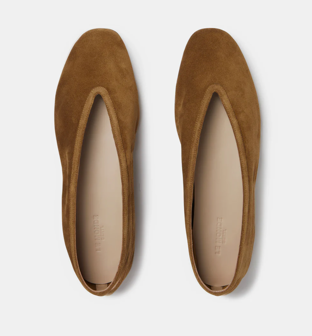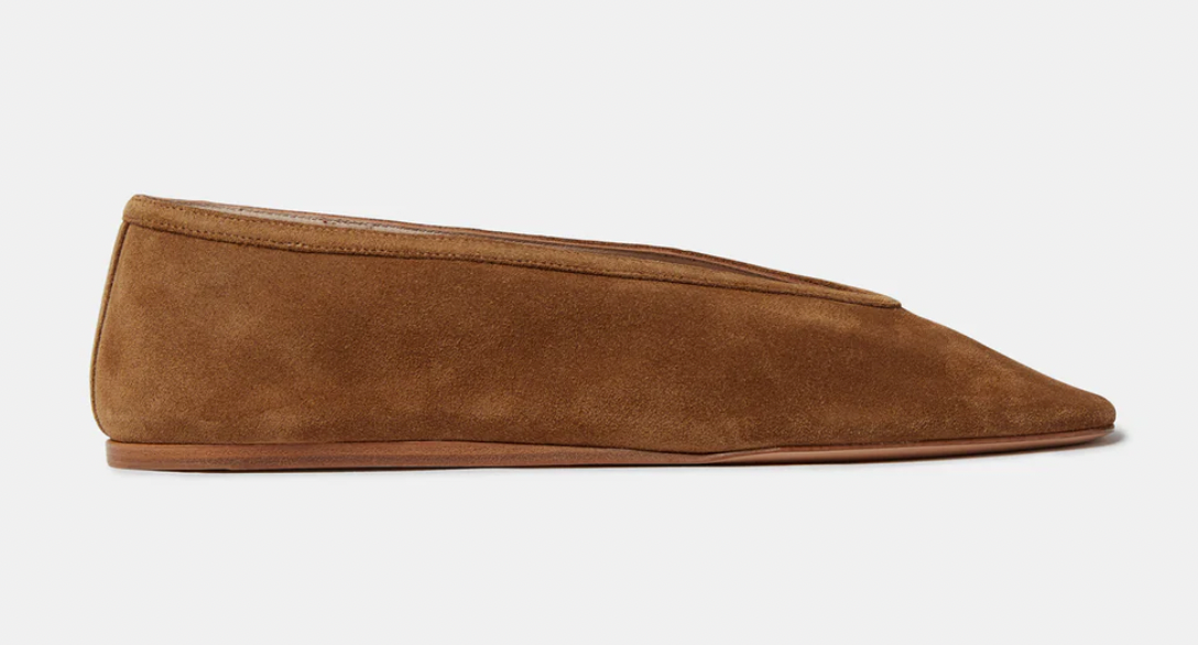 The Luna Slipper in supple taupe suede, deconstructed lambskin, a cushioned calf leather insole and leather piping.