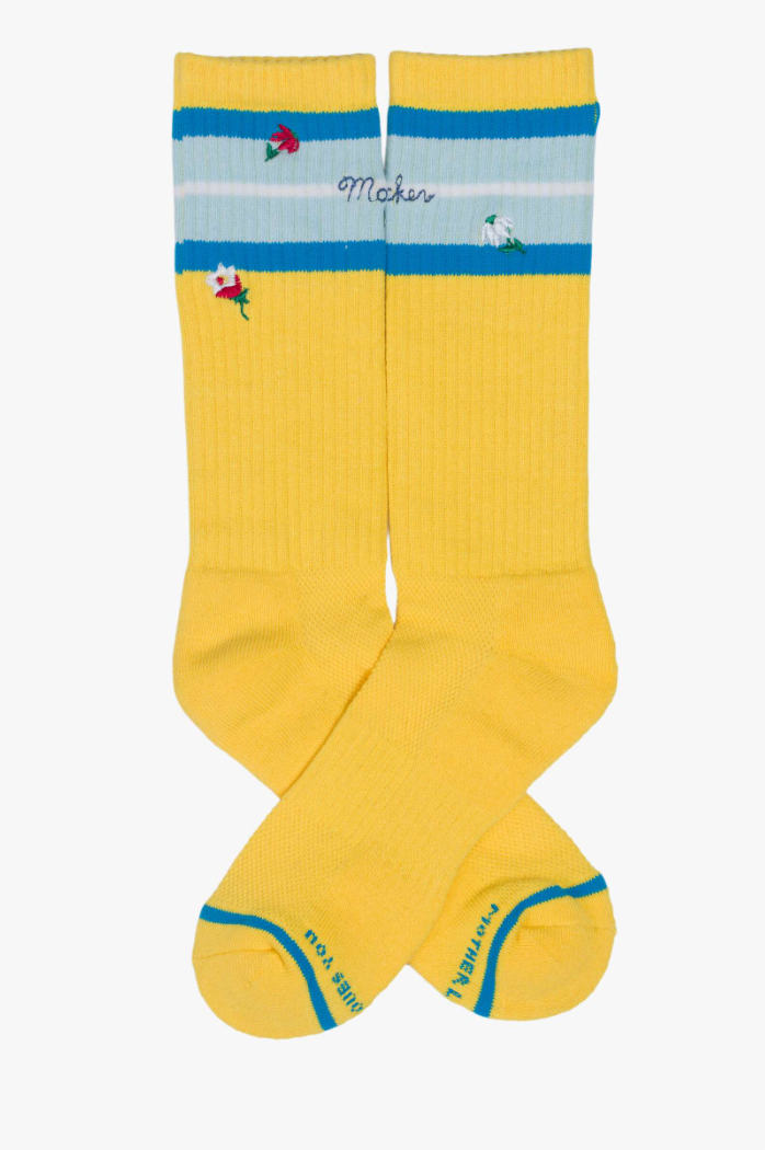 Watch your step. Extra-tall tube socks with an explicit message from MOTHER. Shown here in yellow with blue stripes and text across the top.