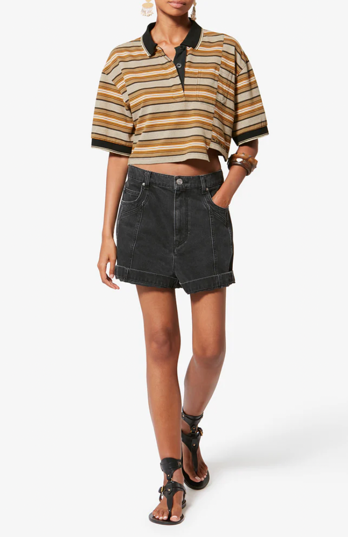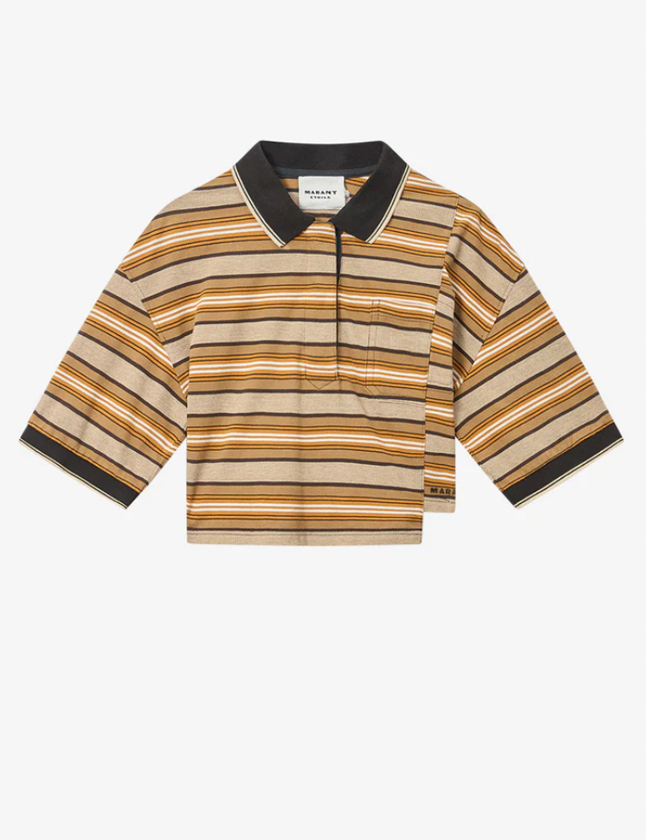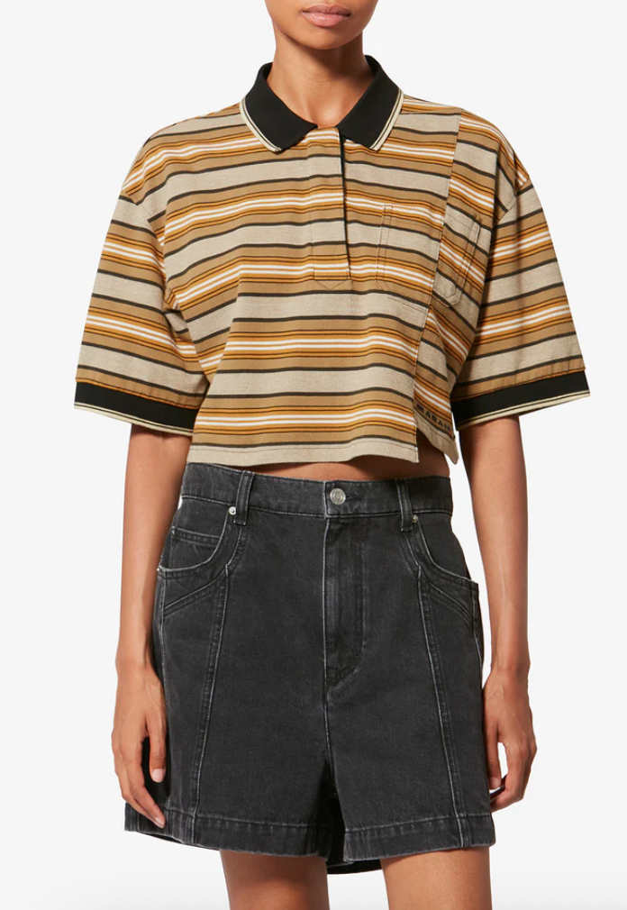 Striped organic cotton piqué polo top with contrasting polo collar extended by a hidden button tab. Short sleeves with dropped armholes and patch pocket on the chest.