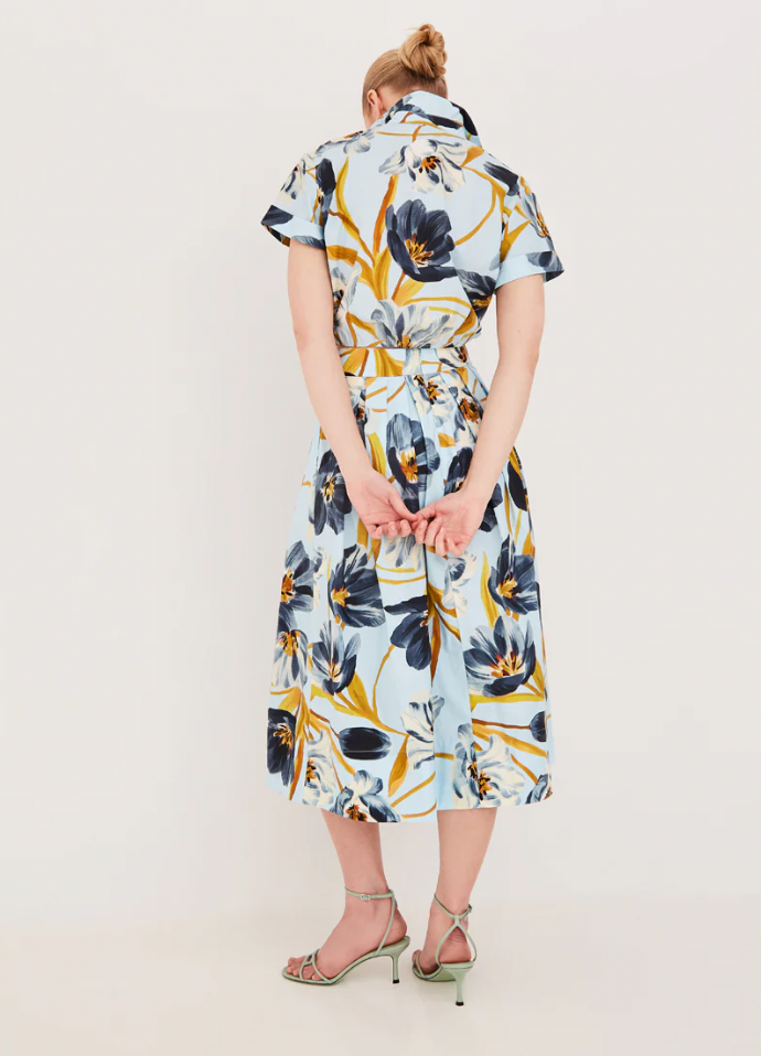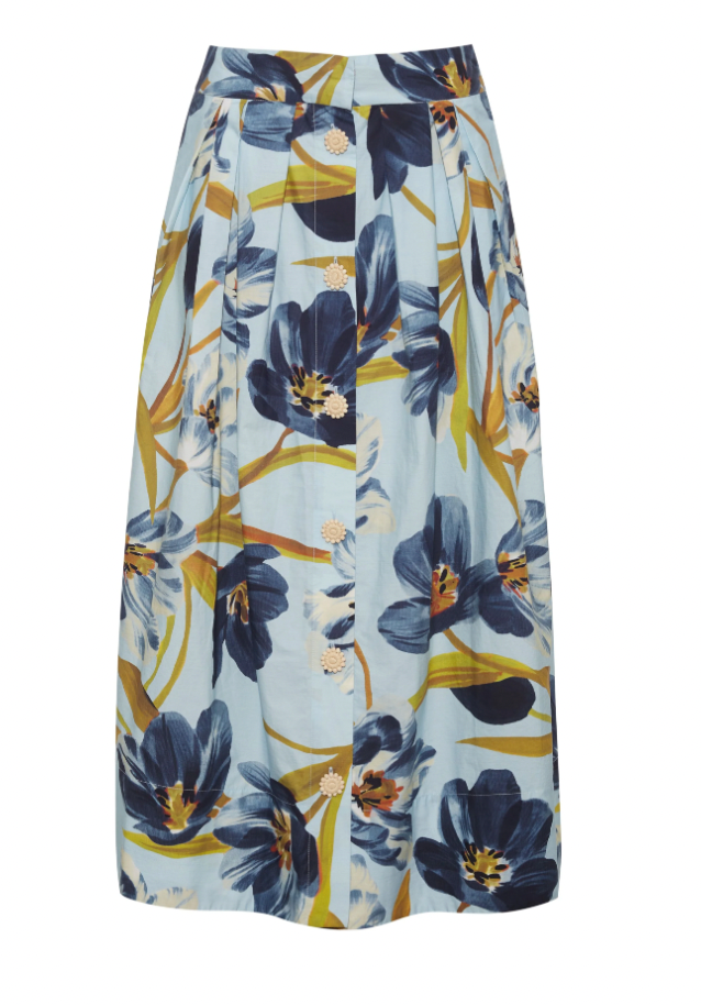 The Marge Skirt an effortless midi-silhouette cut in crisp cotton poplin, the functioning handmade novelty buttons add gorgeous texture against the vintage inspired floral print. Pair with a matching Asbury Top.