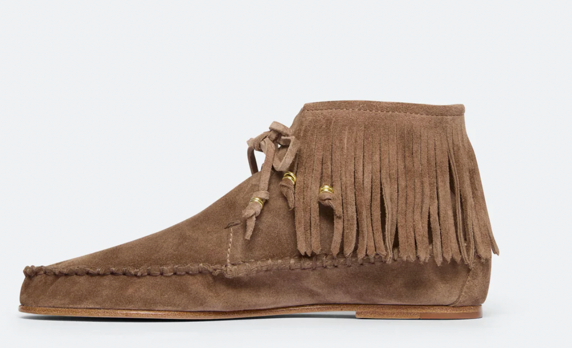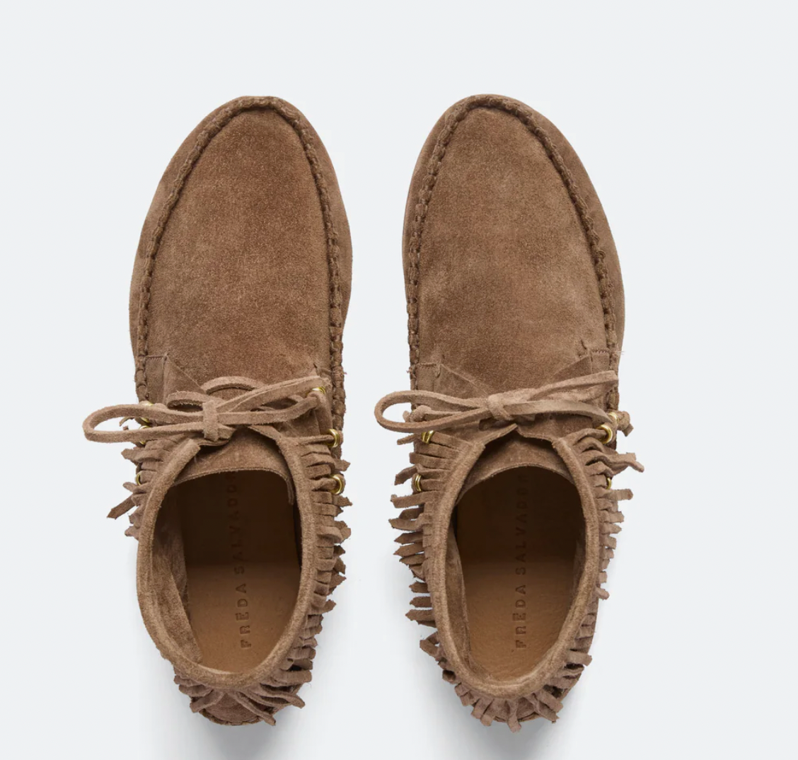 Our must-have fringe boot—super soft suede in a low profile bootie with fringe and gold lace rings. Equal parts comfortable and effortlessly cool.